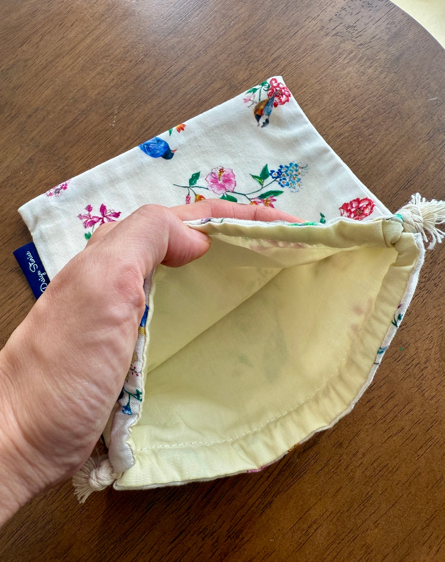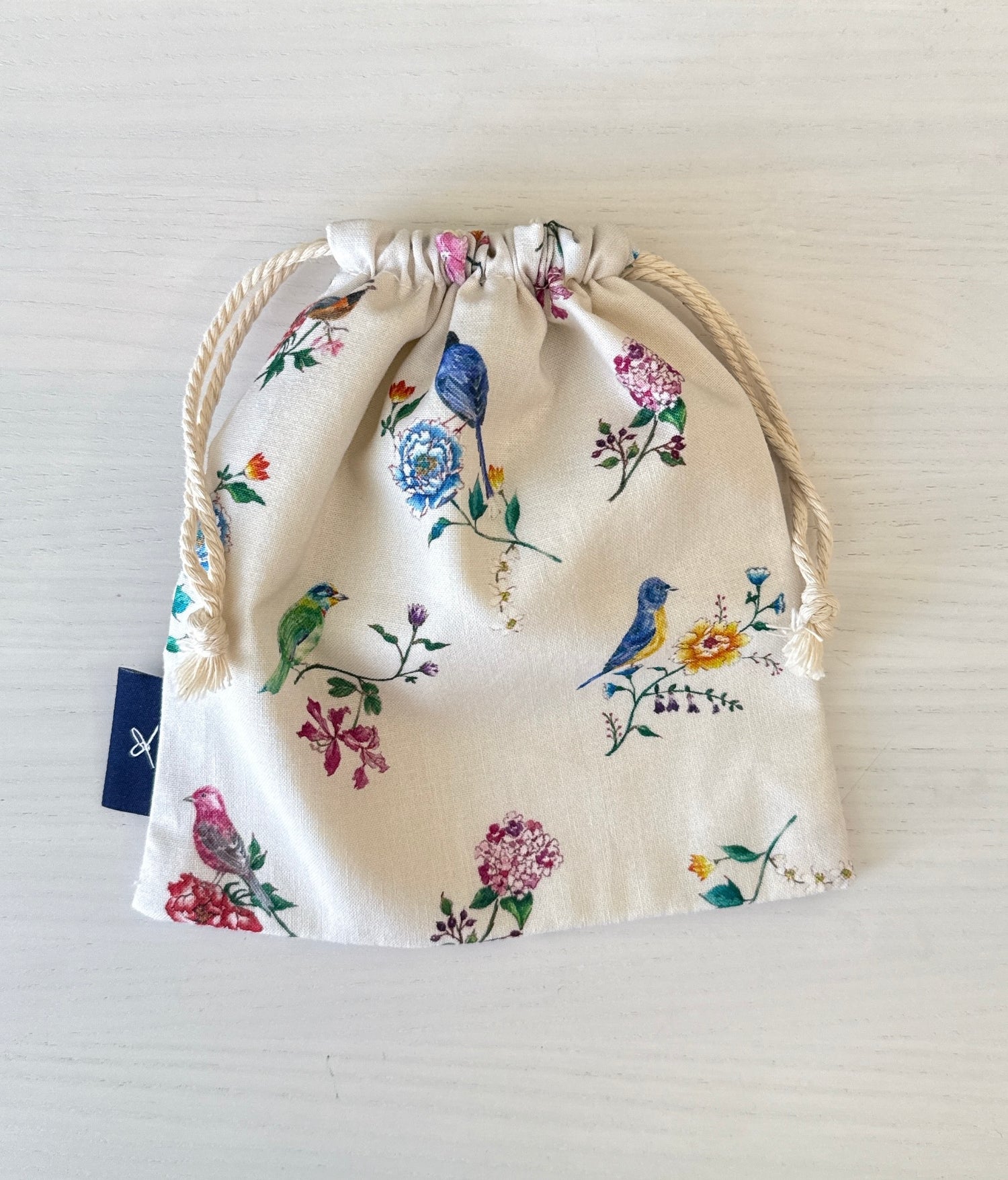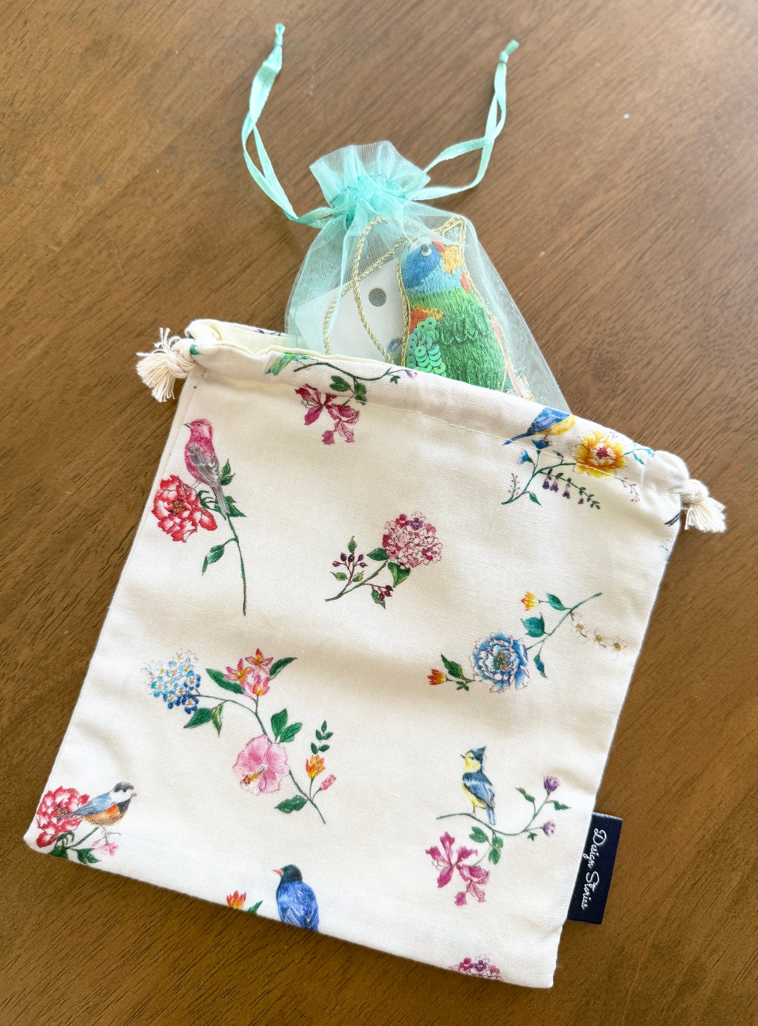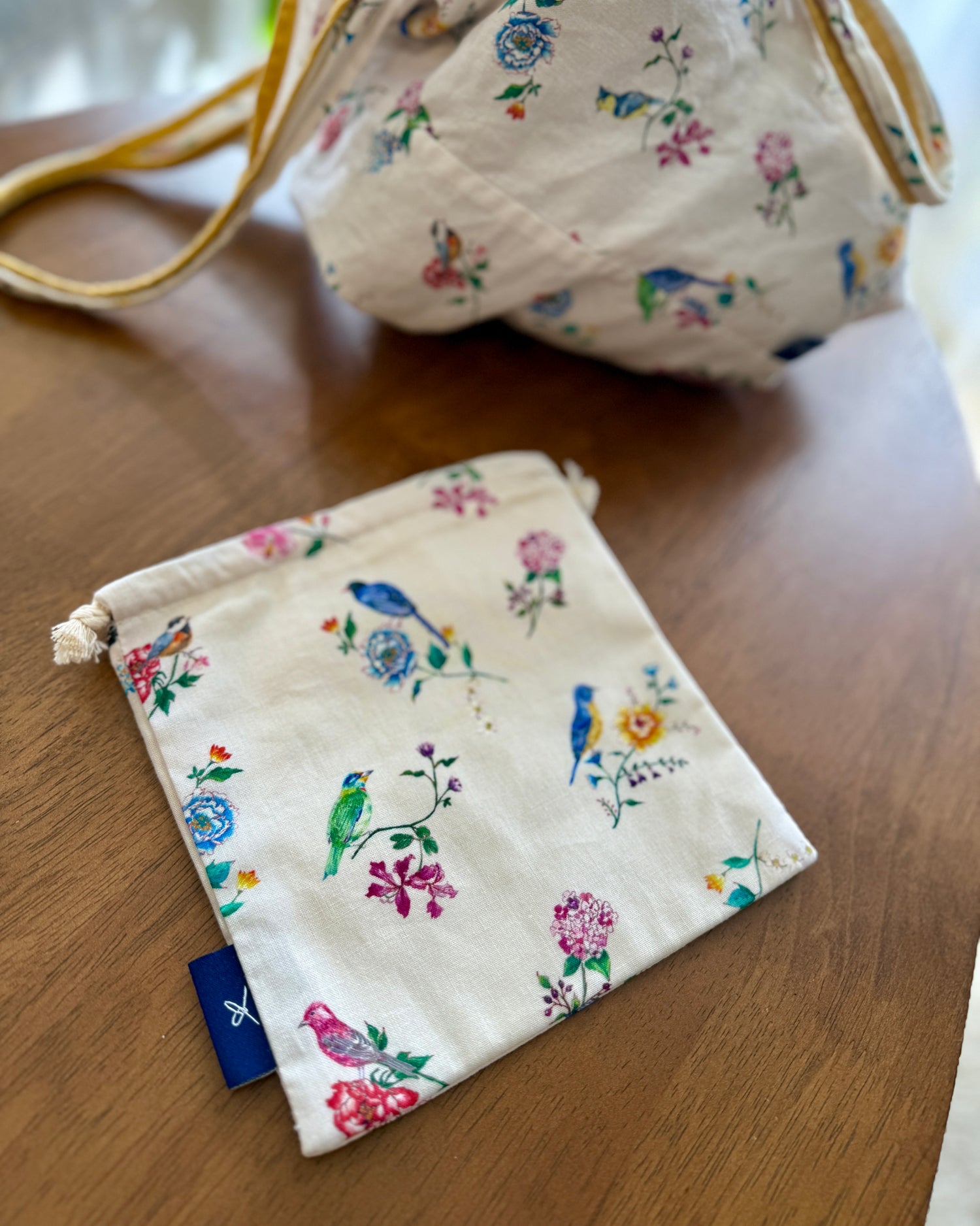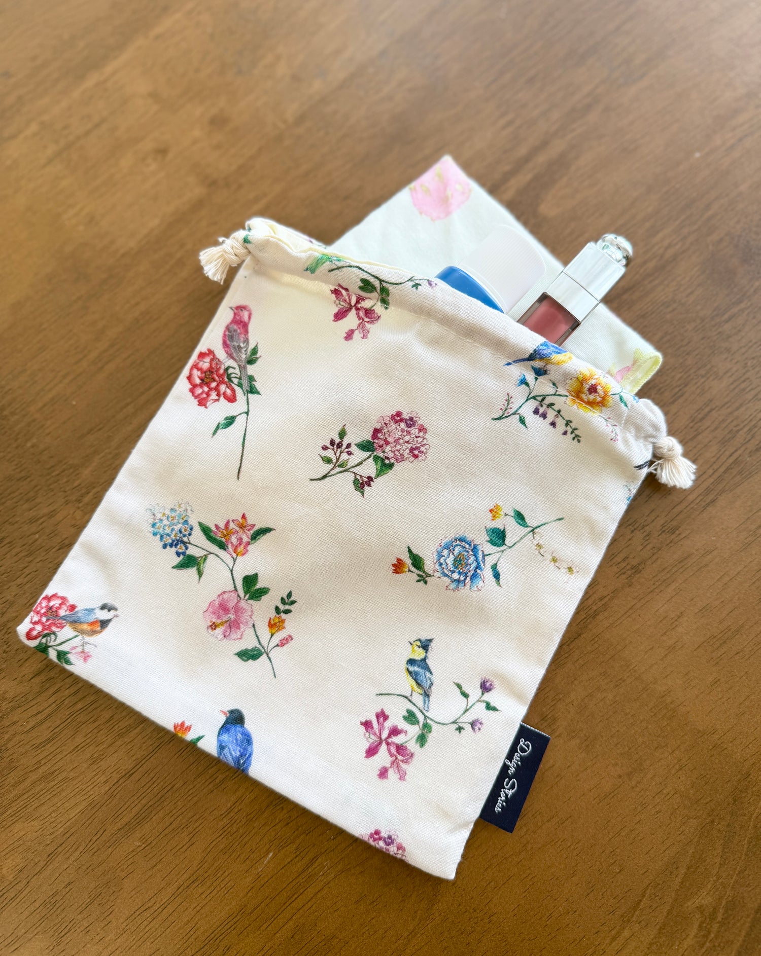 Design Storiesの人気のコットンショッピングバッグを作る際に発生するハギレが勿体なく、その布を活用した巾着袋を作りました。内側には、コットン100%の無地の内布を使用していて、透けません。いろいろな小物を入れたり、バッグの中で日々便利に使えます。