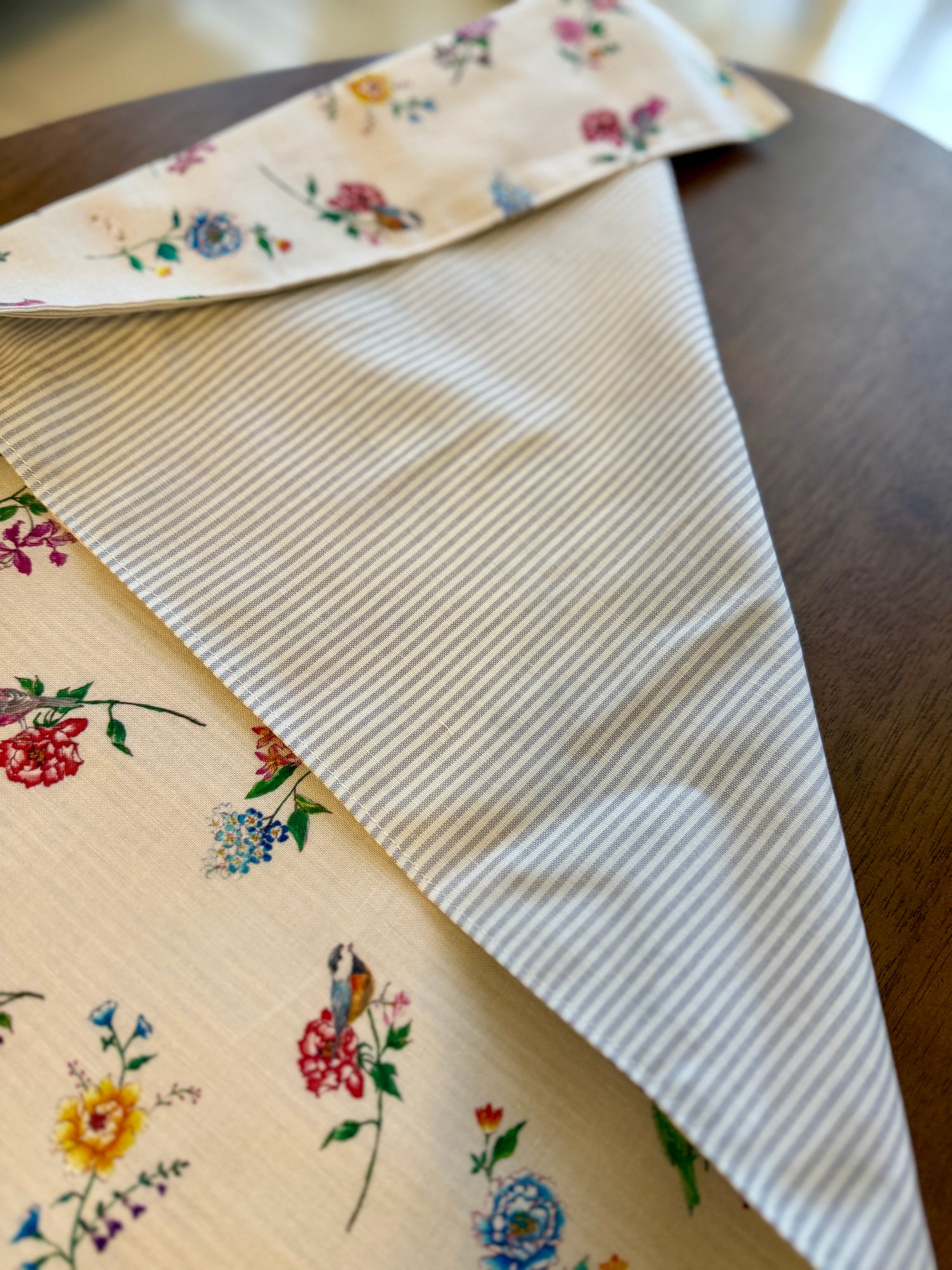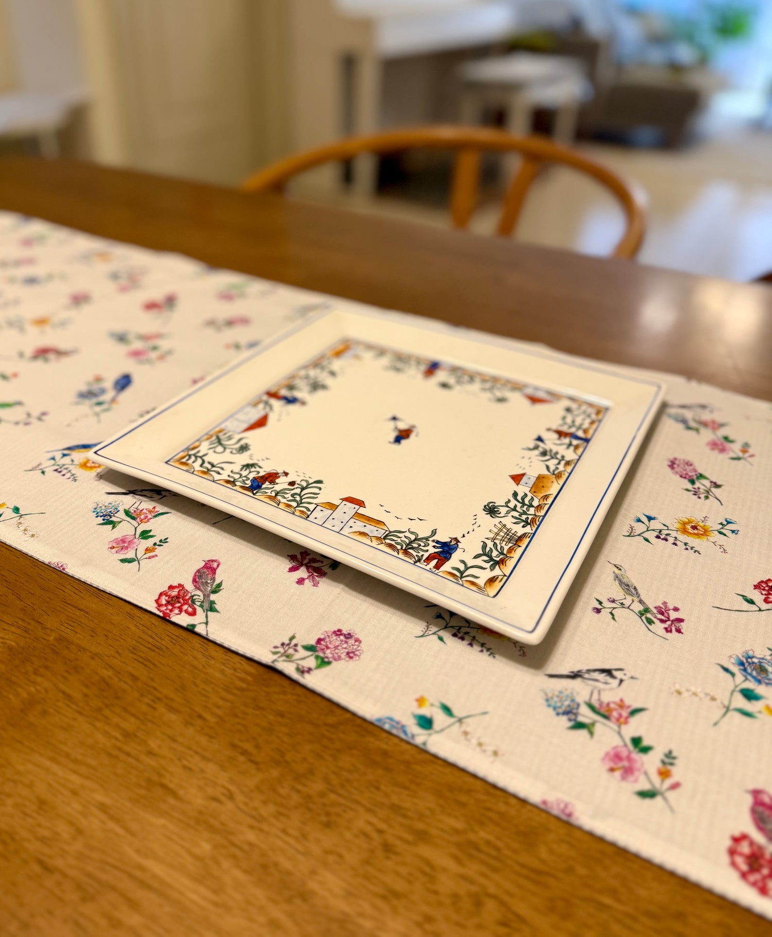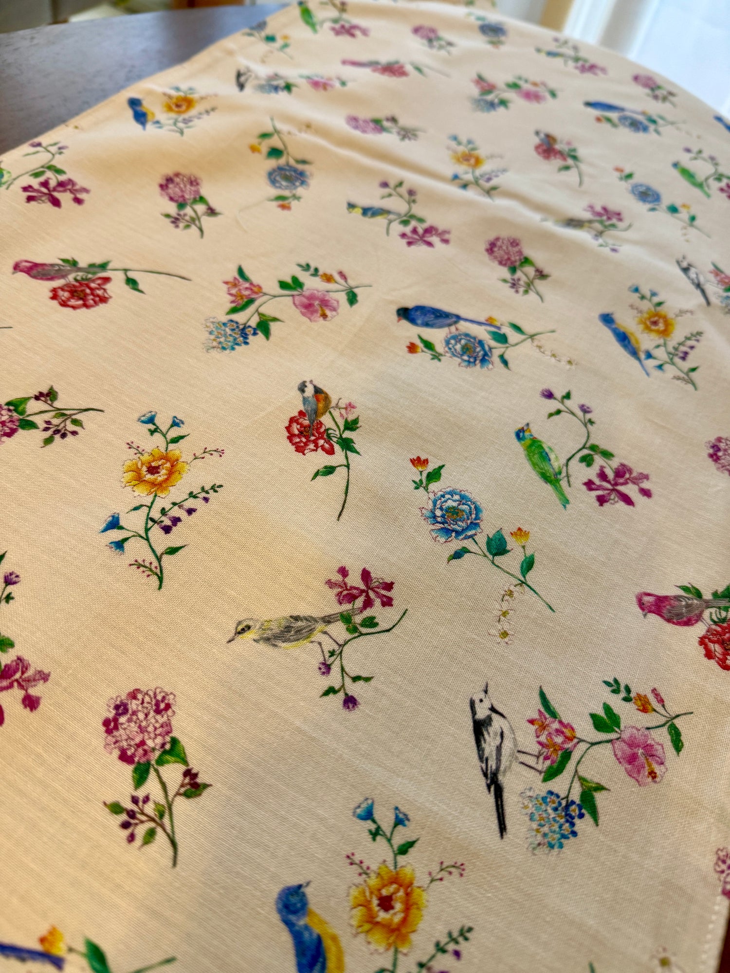 水彩画で描いた台湾の野鳥や花の柄のテーブルランナーを作りました。鮮やかな鳥たちと花の模様がシノワズリな雰囲気を作り、テーブルを明るくする素敵な一枚です。