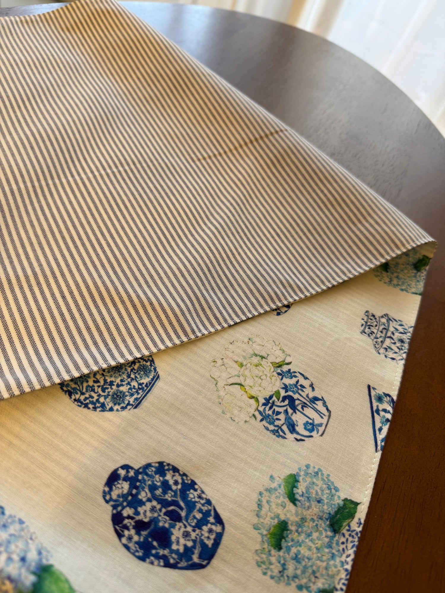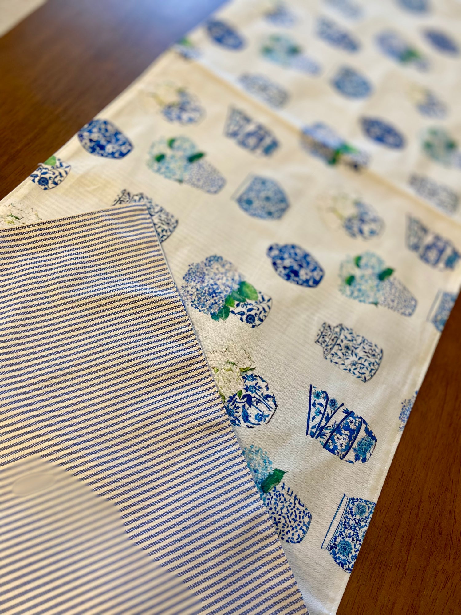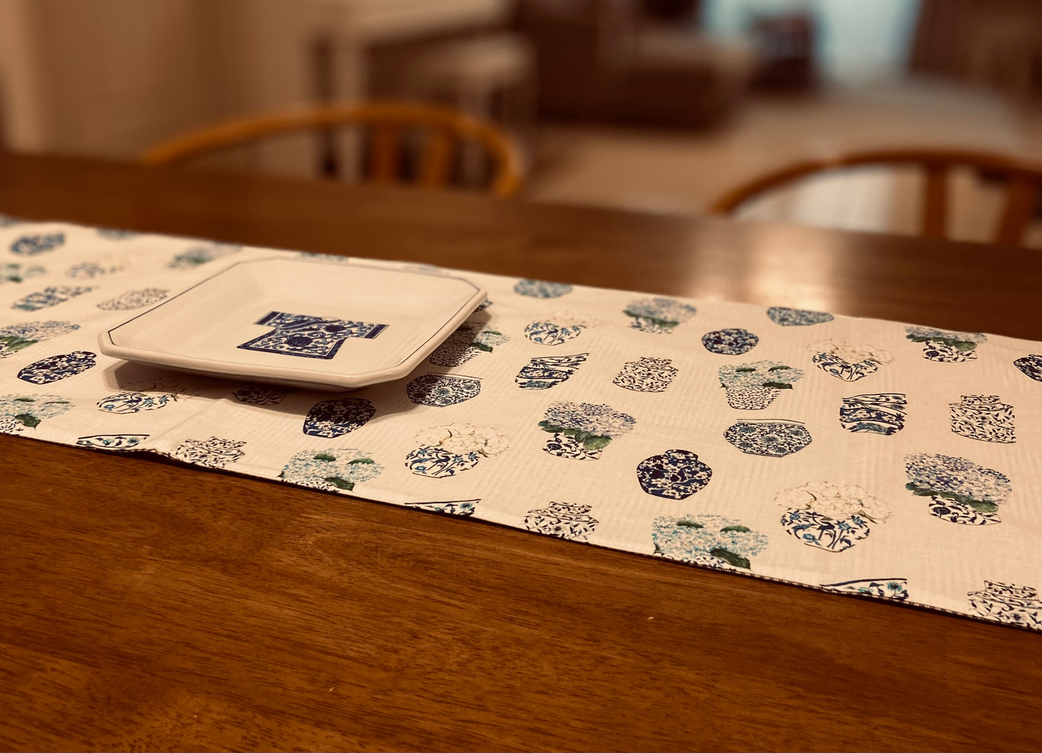 人気の青と白の柄でテーブルランナーを作りました。水彩画で描いた青と白の陶器の絵がシノワズリな雰囲気を作り、また、ところどころの紫陽花の花や芍薬の花が美しい柄です。 リバーシブルとなっており、裏側は厚地のブルーのシンプルなストライプ柄になっています。気分によって、どちらの面でもテーブルコーディネートを楽しめます。 台南で一つ一つ丁寧に裁断、縫製したハンドメイドの品になります。オンラインショップだけの限定販売です。
