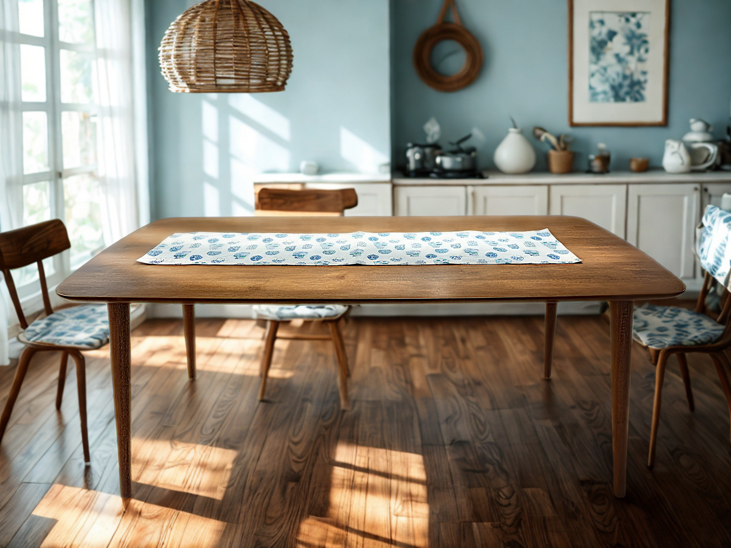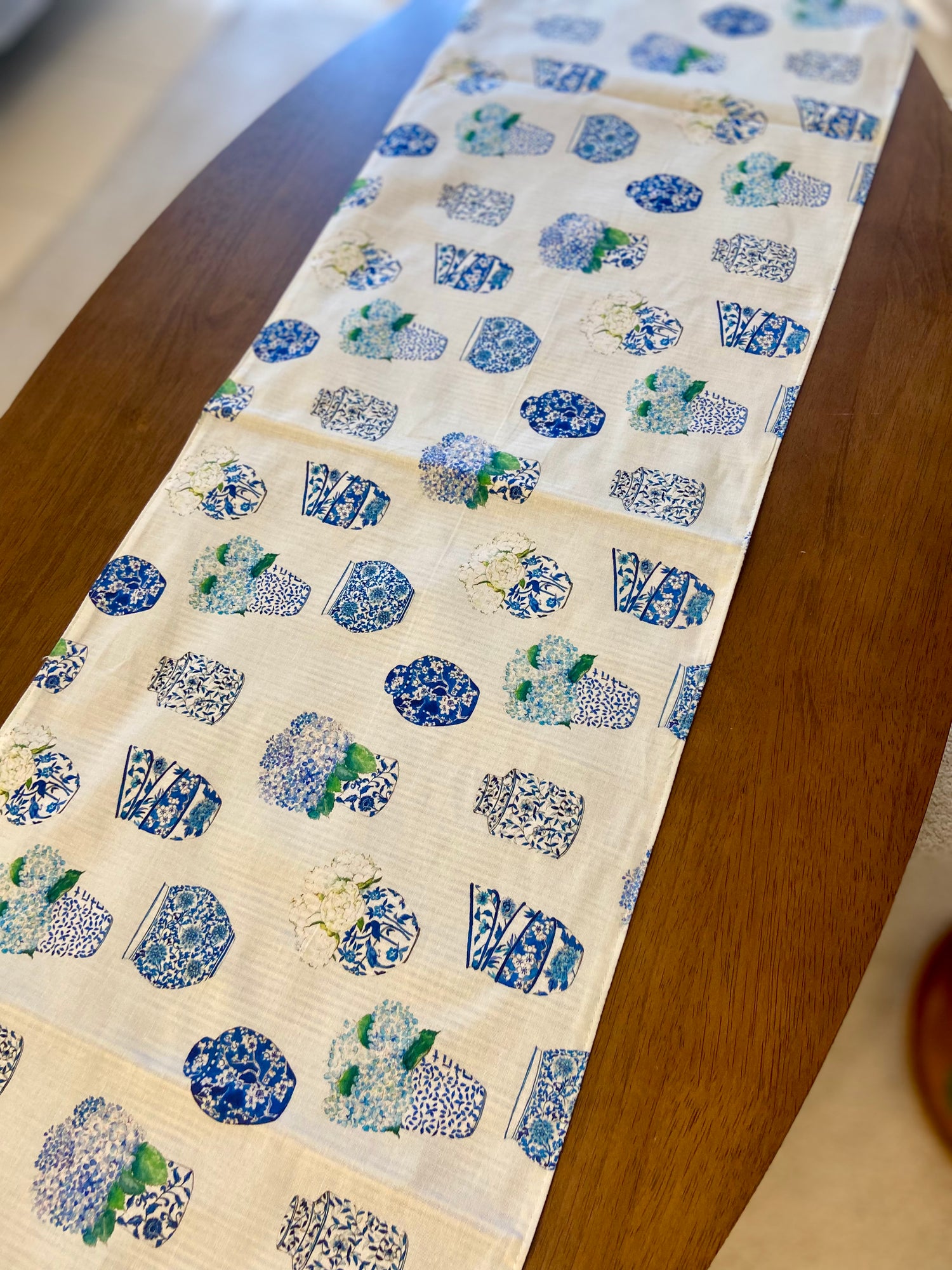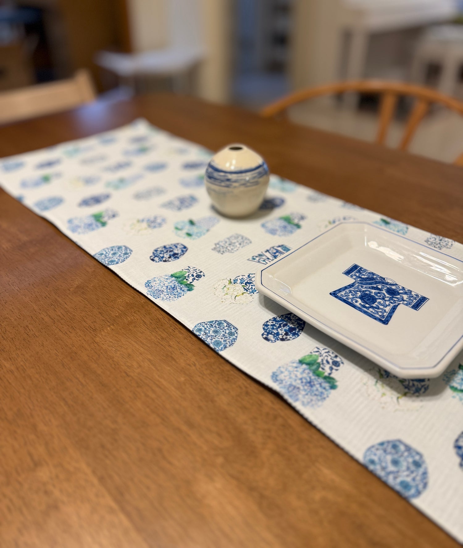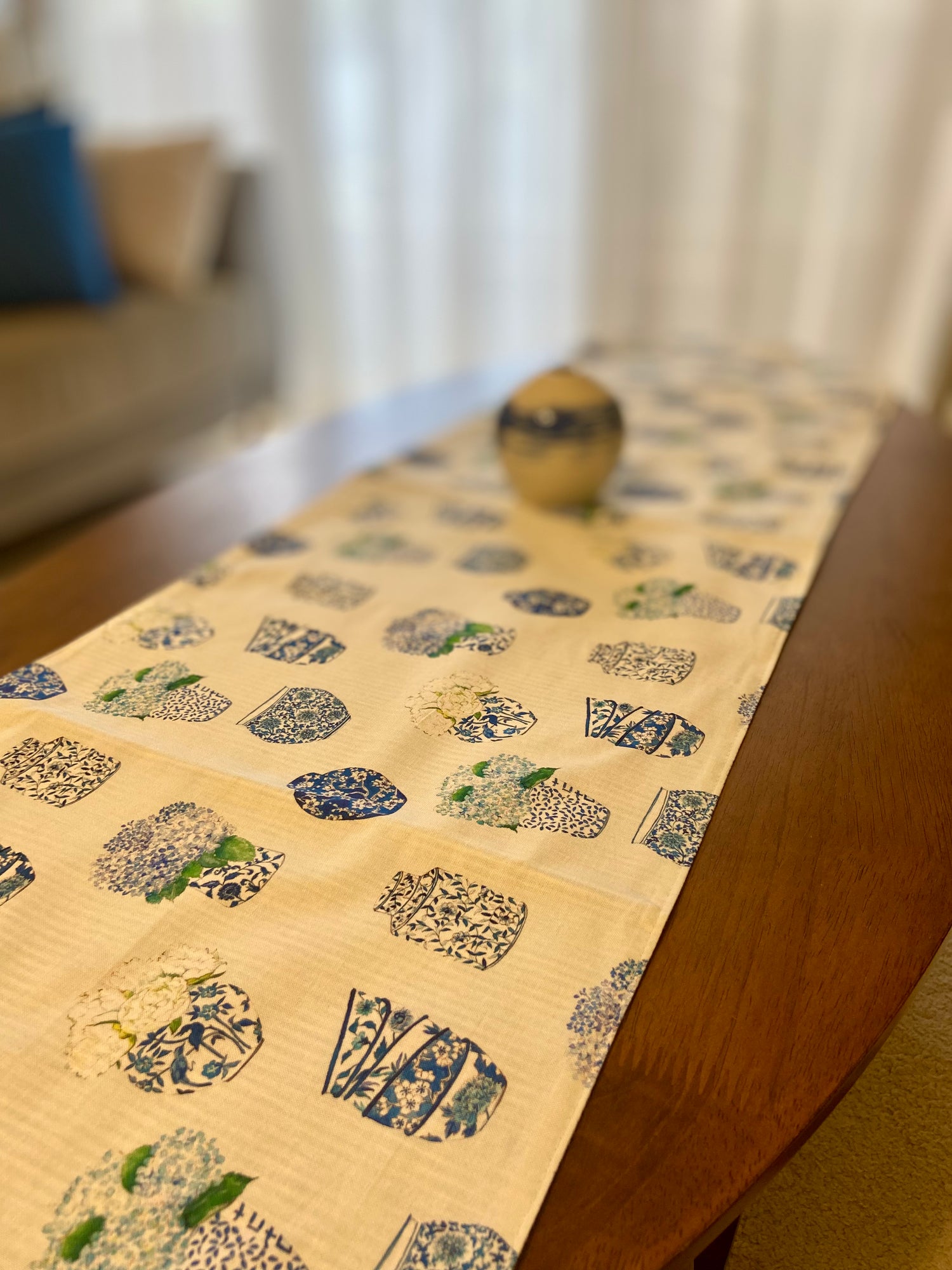 人気の青と白の柄でテーブルランナーを作りました。水彩画で描いた青と白の陶器の絵がシノワズリな雰囲気を作り、また、ところどころの紫陽花の花や芍薬の花が美しい柄です。 リバーシブルとなっており、裏側は厚地のブルーのシンプルなストライプ柄になっています。気分によって、どちらの面でもテーブルコーディネートを楽しめます。 台南で一つ一つ丁寧に裁断、縫製したハンドメイドの品になります。オンラインショップだけの限定販売です。