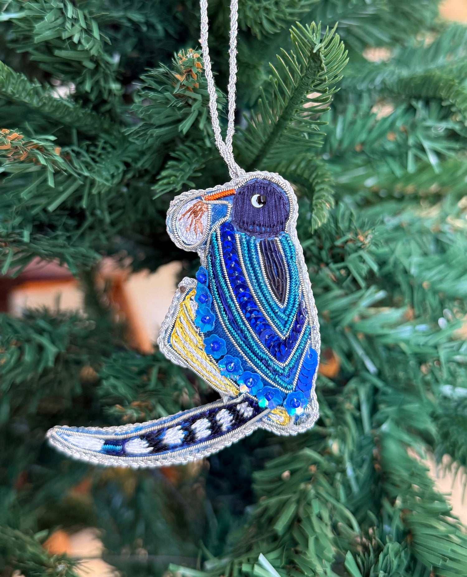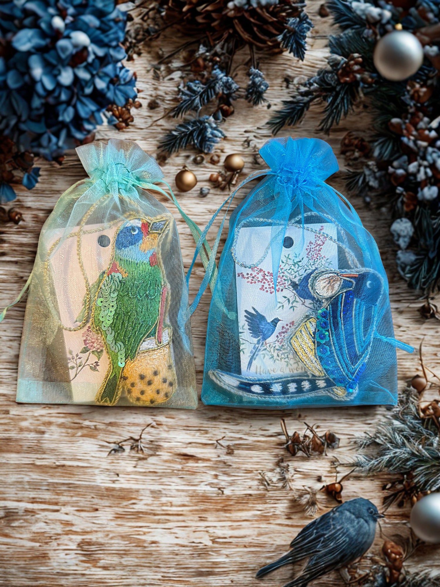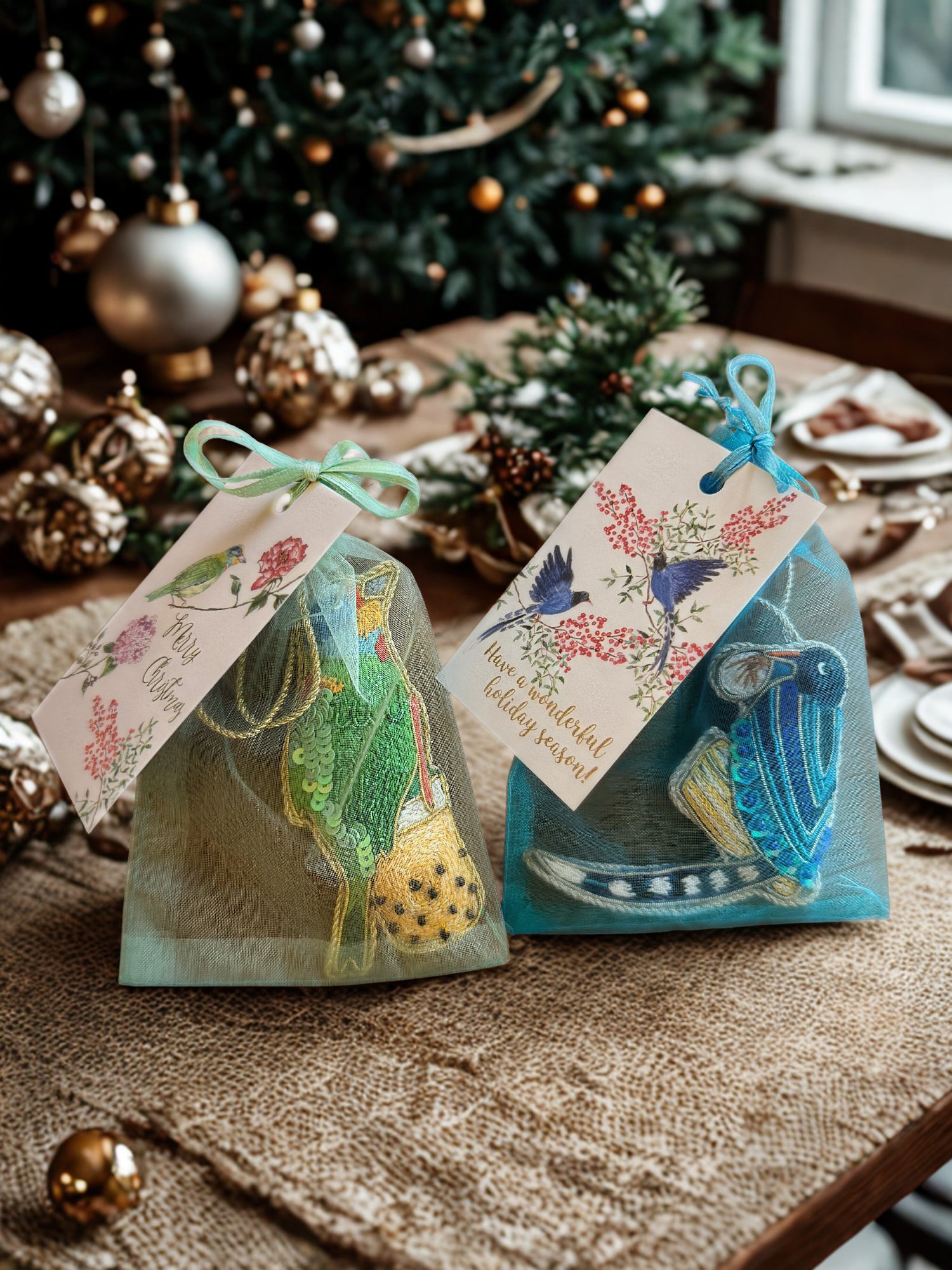 オーナメントは藍色のメッシュ袋にお入れします。袋の中には、